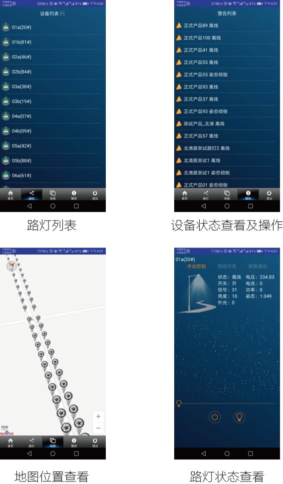 路灯可由监控系统控制使用,监控系统分为 Web 版和手机 APP 版两个版本,可实现路灯的开关、调光控制。简洁直观的用户界面,简单方便的操作系统,耐心的售后服务,获得了客户的一致好评,YABO鸭脖尽全力提供给用户最好的服务。
