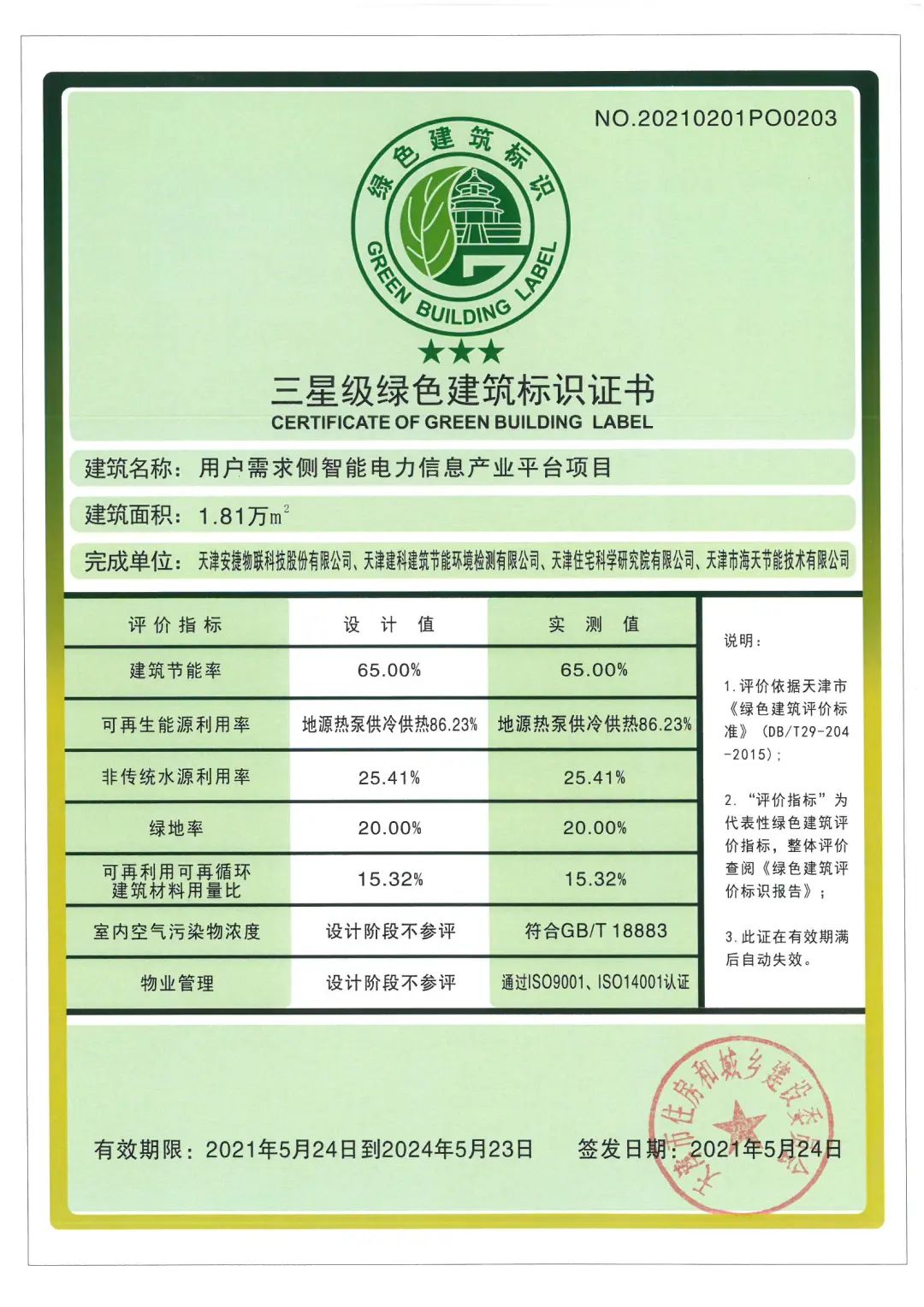 目前,YABO鸭脖物联能源互联网大厦在建筑节能率、可再生能源利用率、非传统水源利用率、绿地率与可再利用可再循环建筑材料用量比等多项评价指标中,设计值与实测值完全一致,同时,建筑室内空气污染物浓度符合GB/T 18883,物业管理通过ISO9001、ISO14001认证。